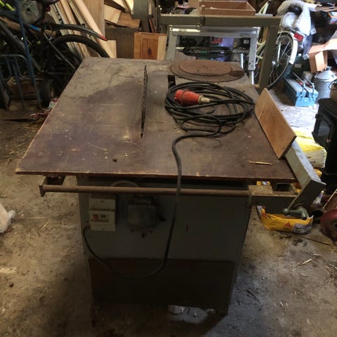 Bordrundsav med høvl og fræsermed, brugt til træbearbejdning. Maskinen har en robust konstruktion og er velegnet til præcisionsskæring af træemner.