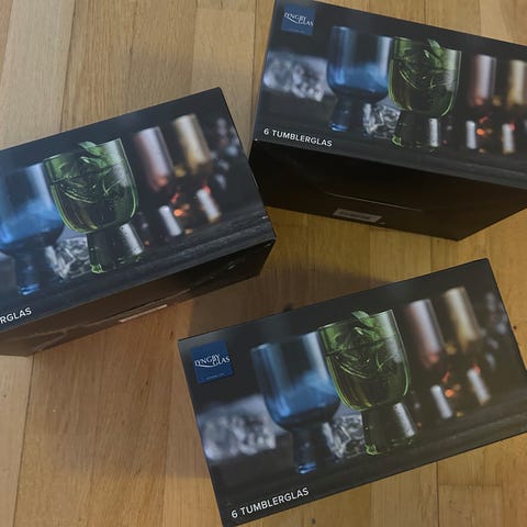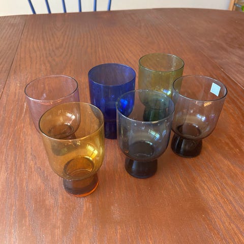 Glas, Tumling glas, 6 bordeaux / blommefarvet tumling glas. 10 cm høje og 7-11 cm i dia. Samlet pris ialt