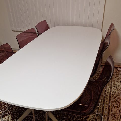 Næsten ingen tegn på den er brugt. Købt for 2 år siden men næsten ikke gjort brug af. Kan gøre til 6-mands bord. Stole har heller ingen tegn på de brugt.