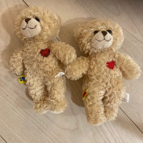 Build-A-Bear bamse med mønster af røde og lyserøde hjerter. Blød og krammevenlig bamse i stof, velegnet som legetøj til børn.