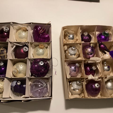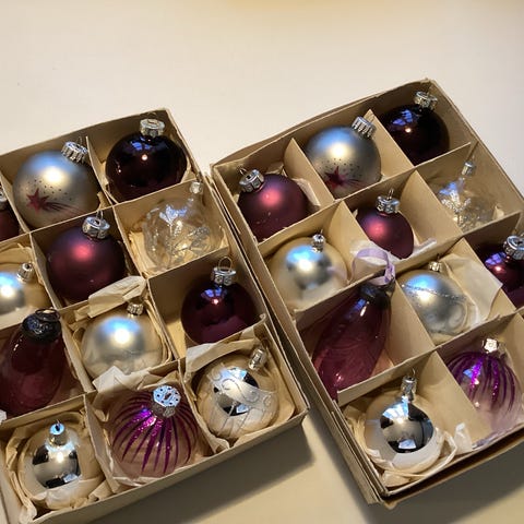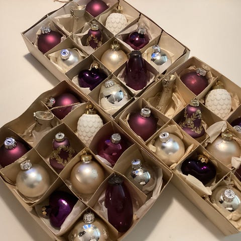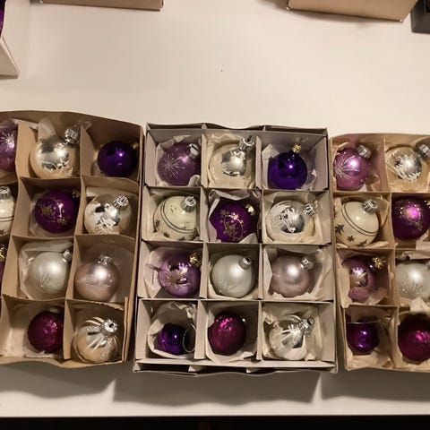 Vintage Julekugler, Flotte gamle glaskugler, ornamenter og figurer, smuk julepynt i guld, hvid og smuk dyb lilla. Der er lidt forskellig alder, stand og størrelse, noget er fra 50-60erne, 80’erne, noget fra 00erne og nogle dele nyere. Der er sjældne kugler og smukke ophæng. Den fine julepynt kan naturligvis have almindelige aldersbetingede brugsspor, men de er stadig meget smukke.