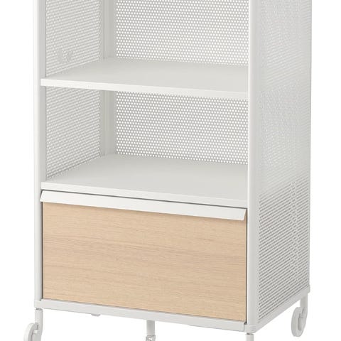 Sælger denne praktiske IKEA BEKANT rullevogn/kommode, som både kan bruges på kontoret og i hjemmet. Den har et stort, dybt skuffemodul i trælook og en åben hylde øverst med perforerede metal sider – perfekt til opbevaring af mapper, printerpapir, elektronik eller diverse kontorting.