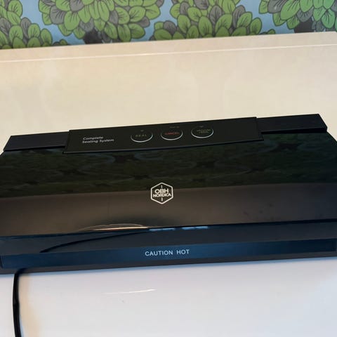OBH Vakuumpakker med betjeningspanel til vakuumforsegling af madvarer. Enheden er sort og har funktioner til vakuumpakning og forseglingsindstillinger. Velegnet til husholdningsbrug til opbevaring og forlængelse af levetiden på fødevarer.