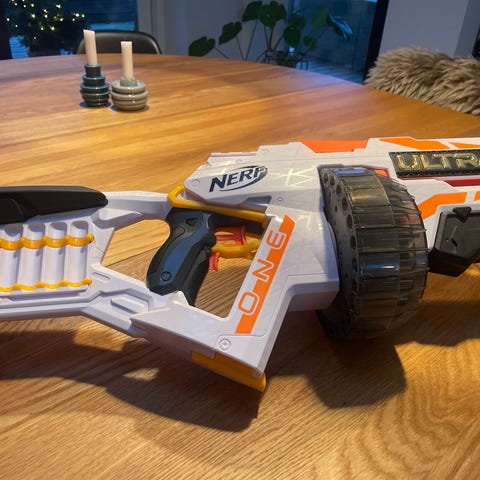 Fed Nerf Ultra One uden skrammer. Mangler kun et skud, men ellers fungerer den lige som den skal. Den er automatisk og man skal bruge 4 stk. C batterier.