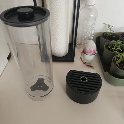 Tilbehør til Nespresso kaffemaskine. Aftagelige dele i plastik og metal, inklusiv beholder med låg og øvrige løse dele til maskinen.