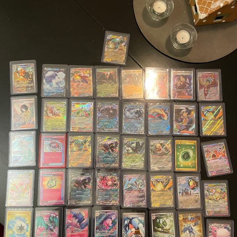 Pokémon samling bestående af diverse kortspilskort i varierende stand og typer. Kortene inkluderer forskellige Pokémon-figurer og er pakket i plastiklommer for beskyttelse. Egnet til samlere og spillere, der ønsker at udvide deres kortsamling.