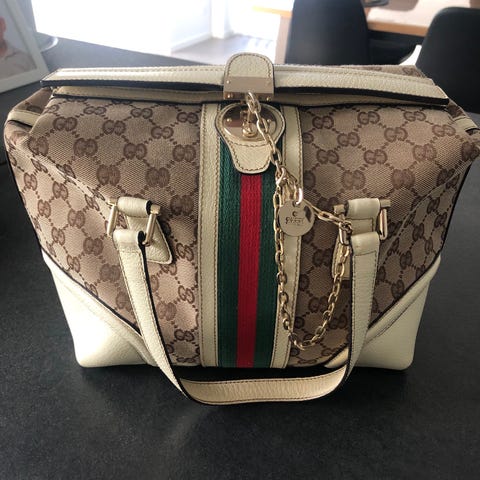 Gucci stof håndtaske til kvinde i lyserød nuance med guldfarvede metaldetaljer. Tasken har en rummelig indvendig lomme med lynlås og to skulderstropper. Designet til daglig brug med fokus på funktionalitet og stil.