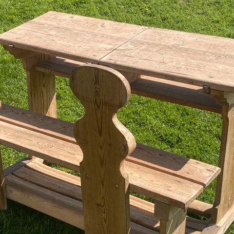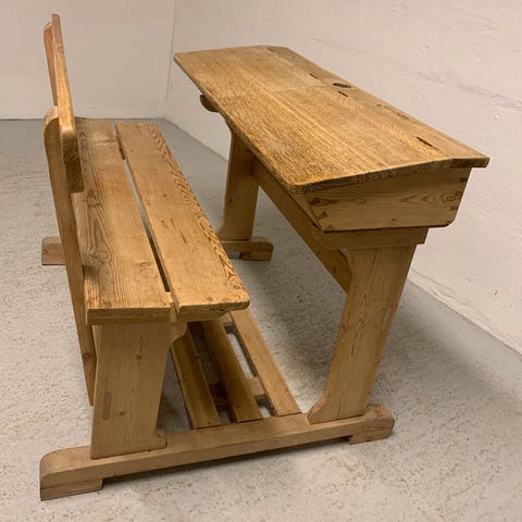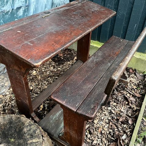 Gammel dobbelt skolebænk. 120 cm lang, 75 cm bred. Højde 90 cm.