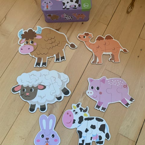 Indeholder 6 små puslespil med sjove jungledyr – perfekt til de mindste, der skal øve finmotorik og lære dyr at kende.