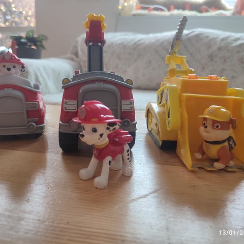 Paw patrol biler med figurer. Alle kan tages ud af bilen. Dog ikke den bagerste røde til højre. Den er fjernstyret og figurerne kan ikke tages op. Billedet er lidt rødligt. Med farven i virkeligheden er normal. Sælges for 65 kr pr stk.