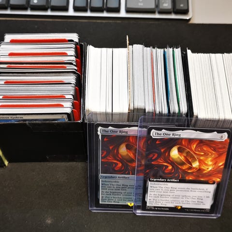 En mappe med masser af kort, 2 deckboxe med 100 sleeves fra Dragonshield, en playmat og en kasse med common/uncommon kort.