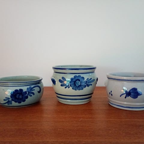 En ældre aflang stentøjs skål / leverpostejsform med den velkendte blå/grå saltglasur og med påmalet blå blomster. Hvis du ikke ønsker at bruge den i køkkenet eller til servering kan den også fint bruges som en urtepotte til en lille sammenplantning eller som vase med oasis og sæsonens blomster.
