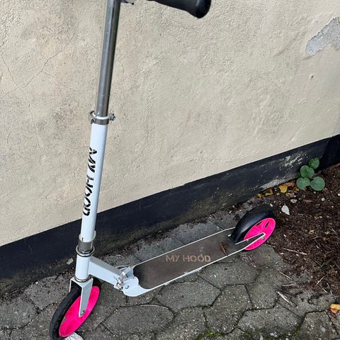 Sælger dette brugte My Hood løbehjul med blå hjul og sort stel. Løbehjulet har justerbart styr og er designet til børn og unge.