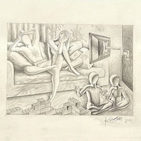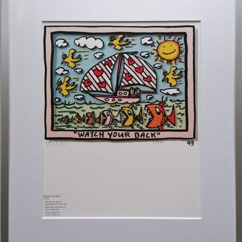 Kristin Kossi maleri af Richie Rich tegneseriefigur med farverig graffiti-baggrund. Motiv viser Richie Rich med pengesedler og karakteristiske tøjdetaljer, herunder rød butterfly og blå shorts.