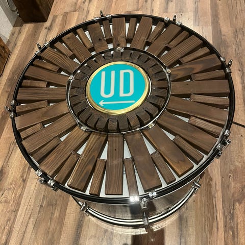 Lamper og borde lavet af et komplet trommesæt.