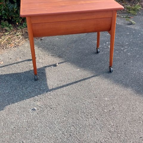Vintage sytøjs- og garnopbevaringssystem i bøg, ca. 1960'erne. Fremstår virkeligt flot og velholdt. Med flere rum og bærehåndtag, kan foldes ud og ind efter behag. Mål: h43,5 cm x b25 cm x L50 cm.