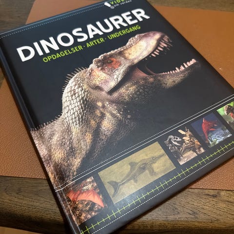 Globes Dinosaur Atlas bog med en CD-ROM, indeholder information om dinosaurer, deres udvikling og forhistoriske verdener. Bogen er illustreret med billeder af dinosaurer og kort. Bemærk, at bogens hjørne er lidt beskadiget.