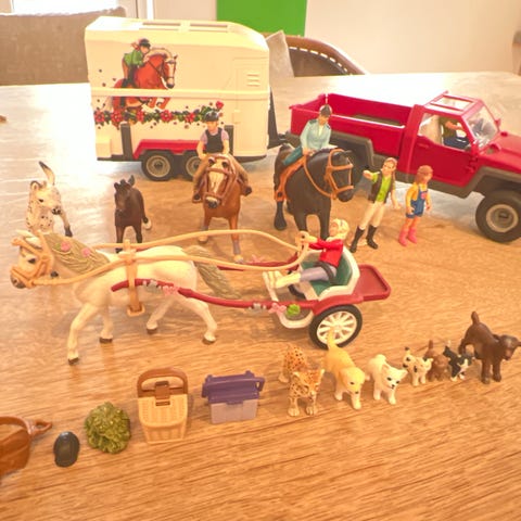 Fin restaurant med person til. og en bil og trailer.to stalde og to hegn.og en vaske stadion.