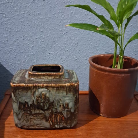 Desiree Stentøj keramik plantekrukke i blå farve. Krukken har et dekorativt mønster og er firkantet i formen. Fremstillet i keramik og produceret i Danmark.