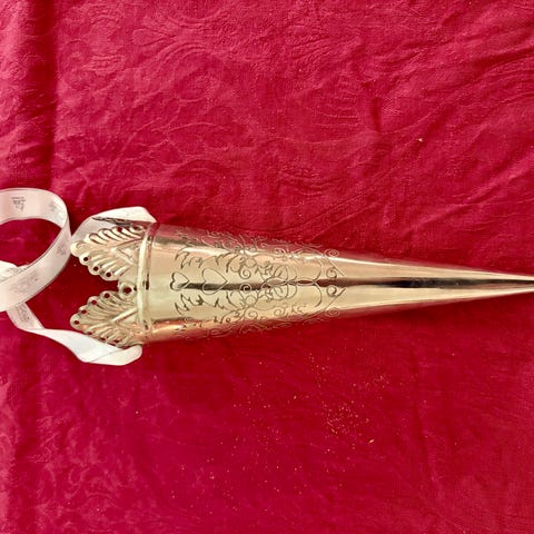 Unik og dekorativ julekugle i sølvfarvet metaltråd med glimmerdetaljer og en sølvkugle i midten. Kuglen er et kunstnerisk udtryk, som passer perfekt til julepynt i moderne eller vintage stil.