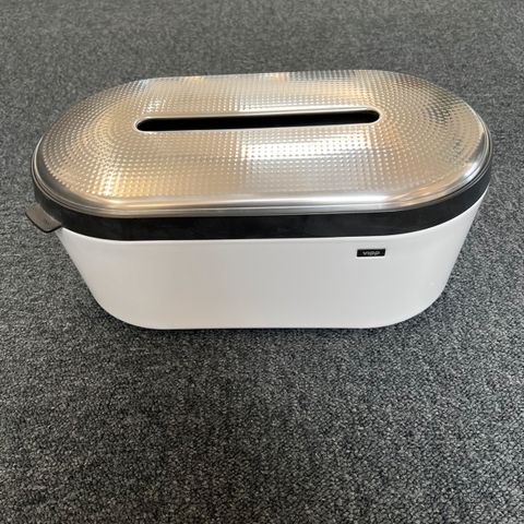 Vipp brødbeholder i sort materiale med låg i rustfrit stål. Beholderen har en oval form og en åbning i låget. Indvendigt er der en sort stofpose. Designet til opbevaring af brød og bagværk.