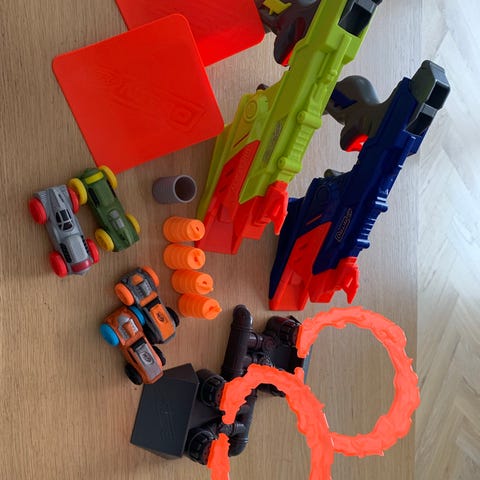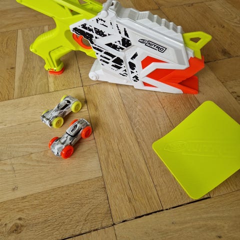 Nerf Nitro AeroFury Ramp Rage blaster. Det er et motoriseret legetøj, der affyrer skumbiler i stedet for pil. Inklusiv batterier, en rampe og to biler.