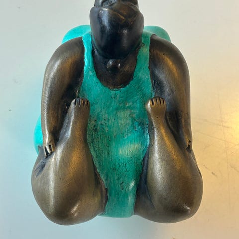 Charmerende og udtryksfuld bronzeskulptur af en kvinde i yogastilling. Figuren udstråler både styrke og ro med sin organiske form og patinerede finish i brun og grønlig bronze. En smuk og finurlig dekoration til hjemmet – perfekt på hylde, reol eller i vindueskarmen.