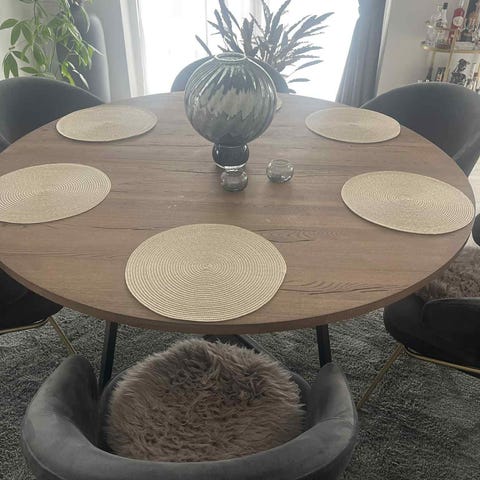Rundt smukt spisebord. Diameter 120 cm. Design Marc Krusin. Overfladen er håndlavet og kan derfor variere. Skulpturbord, en perfekt syntese af skønhed og harmoni i proportioner, præsenteret på Salone 2015 og tildelt flere priser: Iconic Design Award 2015, Good Design Award 2016, Red Dot Award for Product Design kategori 2016. I mødet mellem to volumener opnås den perfekte balance mellem det ene og det andet. Sælges grundet flytning. Ny pris 44.100,-