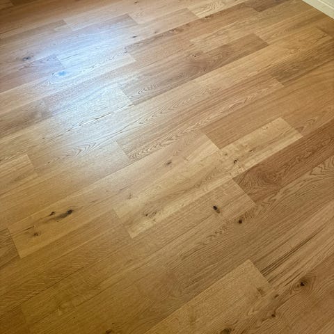 23 originale pakker a 15 plader a 625x200x10 mm., i alt 43,125 m2. Limes til underlag og spartles med fugemasse, slibes og lakeres. Jfr. foto.