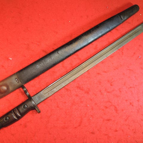 Sjælden US M1905 bajonet, (den originale model 1905) med tilhørende skede. Bajonetten har en forkromet klinge med tilhørende hvid skede. Parade/ æressag?