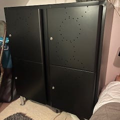 Sort metal skab med to døre og indvendige hylder. Skabet har et minimalistisk design og er velegnet til opbevaring af forskellige genstande som bøger, magasiner eller elektronik. Skabet står på ben (15 cm høje) og har en låsemekanisme på dørene.