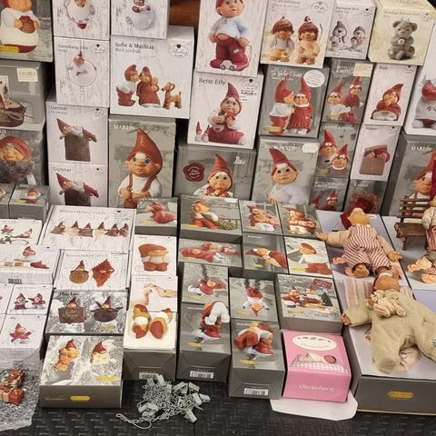 Har ligget urørt i original emballage plast og æsker, åbnet for foto. Nisse med kedel, samt nisse med fugleneg. Numre kan ses på foto af det hvide omslag, der sidder omkring æskerne. De kan afhentes i Horsens eller sendes. Prisen er for begge nisser.