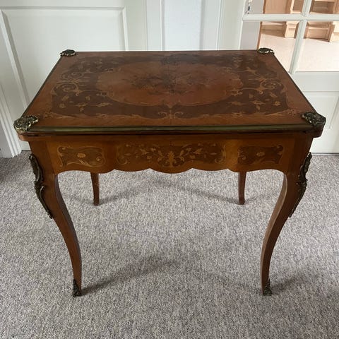 Håndlavet træspillebræt med indlagt farvet design og metalbeslag. Spillebrættet kan foldes sammen og har dekorative detaljer på ydersiden. Passer til spil som backgammon eller lignende. Materiale: træ med metalbeslag.Backgammon, håndlavet, i god stand, kan forhandles