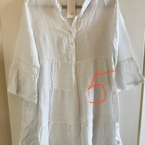Hvid bomulds tunika. Str III Str 40. Håndbroderede border. Ny og ubrugt. Skjult stolpelukning. Ca mål skulderbredde 55cm, bryst talje og bundvidde 148cm. Længde 93cm. Ærme ca 49cm, faldende skuldersøm.