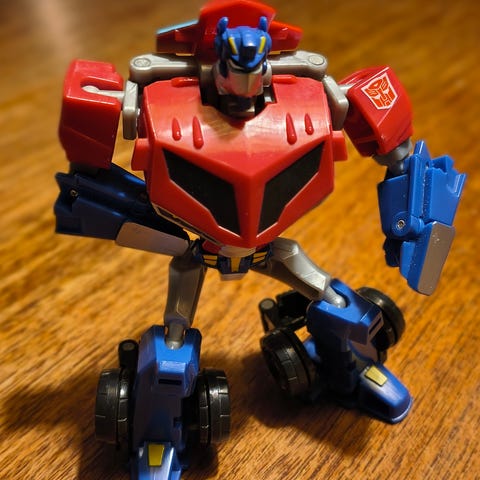 Transformers Optimus Prime actionfigur i rød, blå og beige med tilbehør bestående af forskellige dele og våben. Figuren kan transformeres fra robot til lastbil.