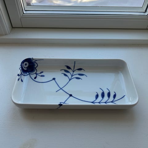 Royal Copenhagen Blå Mega fad med blå blomstermønster på hvid porcelæn. Fadet er rektangulært og egnet til servering eller Royal Copenhagen