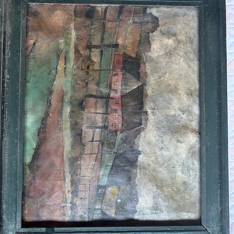 Maleri med motiv af et bybillede, indrammet i en guldfarvet ramme. Maleriet viser en vej med huse og et træ i forgrunden. Bagsiden af maleriet har håndskrevet tekst og er monteret med ophængssnor.