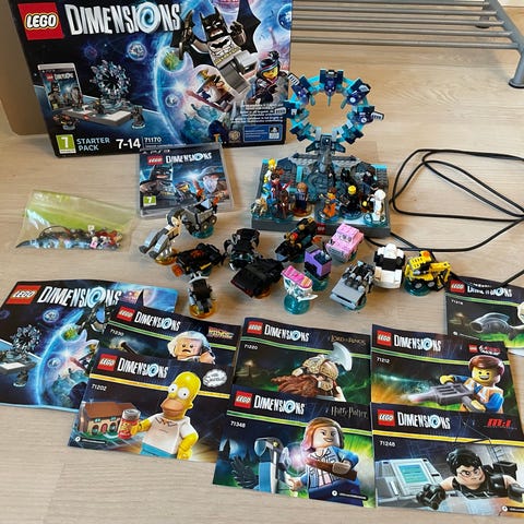 LEGO Dimensions PS4 spil med tilhørende figurer (Ninjago, Harry Potter, Batman og Scoopy Doo team pack (71206), platform, portalbyggeelement og ekstra uåbnet figurer (71227 og 71211) samt en unik samleboks og manual. Passer til PlayStation 4 konsol.