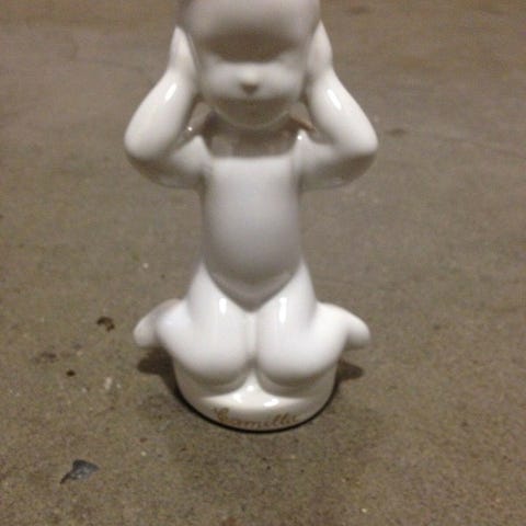Keramik, Figur, Søholm, Sød figur, lille barn, farve turkis. Peter figur vistnok. Højde 15. Lille glasurafslag på den ene fod, som vender bagud og derfor ikke ses. Se sidste billede.