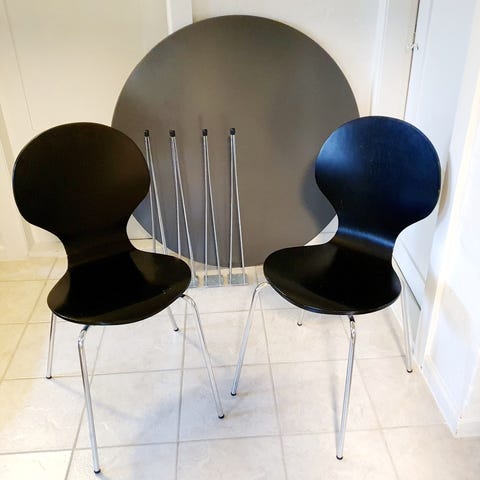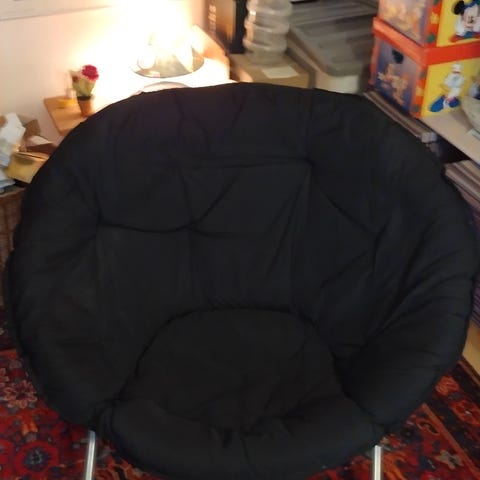 Sort rund stol med stel i metal og sæde lavet af snor. Stolen har et unikt design med åbent sæde og tre ben. Velegnet til indendørs brug.
