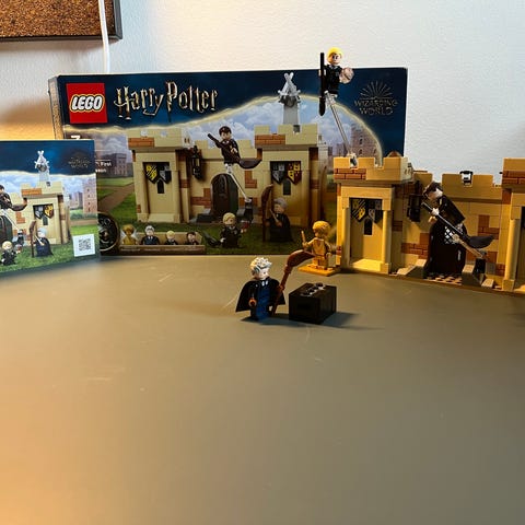 Harry Potter sættet Hogwarts™: Første flyvelektion (76395). Der mangler guldfigur og de flade lilla chokoladefrøer (klods 6342521). Brugsanvisning medfølger, men ikke æsken.