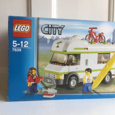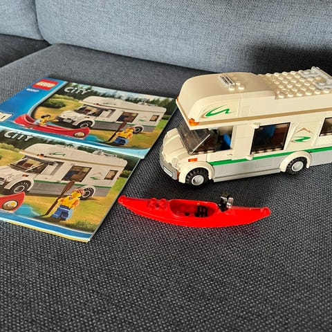 LEGO City campingvogn med tilbehør inklusive rød kajak. Sættet indeholder en hvid og beige campingvogn, der kan tilkobles en rød bil, samt to manualer for samling og brug.