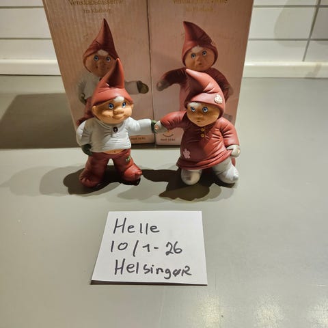 Jeg sælger disse klarborg nisser Victor og Laura. De er hele og pæne og ingen skår I dem. De er I æsker. Sender gerne men portoen kommer oveni. Sender med Dao. Befinder sig I Helsingør. Prisen er 85 kr or. Stk. Er sat til salg I flere grupper