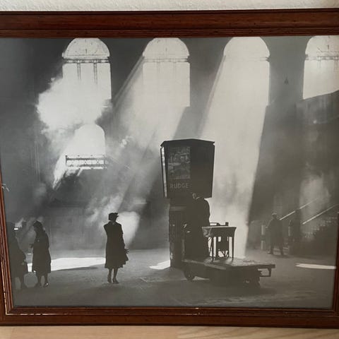 Bill Philip fotografi med motiv af to stole og et træ i et udendørs miljø. Fotografiet er sort-hvidt og indrammet med hvid ramme i sort træramme. Sælges for kun 295 kr ialt