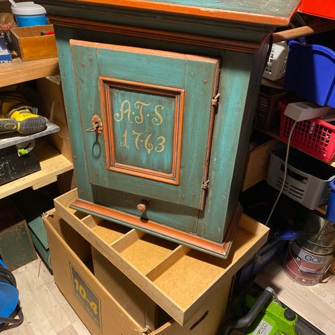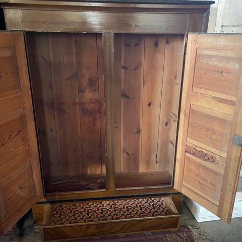 Antikt træskab med to låger, indvendige hylder og to skuffer. Skabet er udført i træ med detaljerede udskæringer og dekorative beslag. Velegnet til opbevaring i stue, soveværelse eller entré.