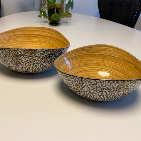 skåle med unikt blåt mønster på indersiden og hvid yderside. Skålene har en rund form og er velegnede til servering af suppe, nudler, salat eller andre retter.