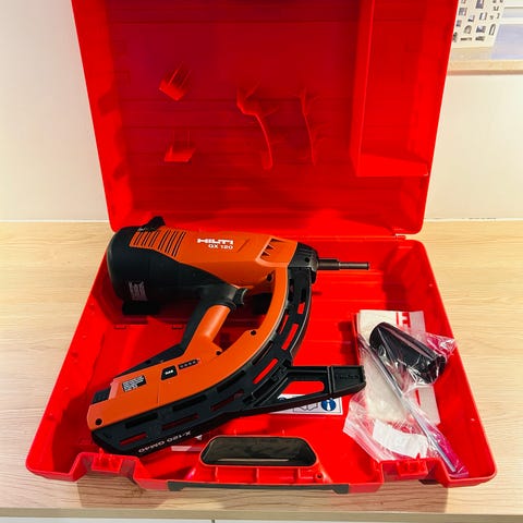 Hilti GX-100 automatisk gasdrevet sømpistol med fastgørelsesværktøj med hård kuffert,Afhentes i:,Røde Kors Odense Byggegenbrug (461),Bemærk at mail, chat og beskeder ikke besvares, og varen skal købes på knappen "Gå til varen"