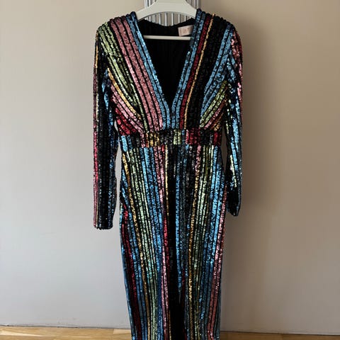 Sort pallietkjole fra Brigitte Bardot, str. M. Dyb udskæring på ryggen, slå-om foran. Helforet, figursyet, lukkes med lynlås i siden. Længde 96 cm. Aldrig brugt. Np 149 €, sælges for 500 kr. pp