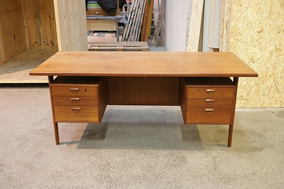 Udtræksbord i palisander træ med rundede hjørner og central støtteben med fire ben. Bordet kan forlænges ved hjælp af udtræksfunktion, hvilket øger bordets længde betydeligt. Designet er enkelt og funktionelt, velegnet til spisestue eller opholdsrum.