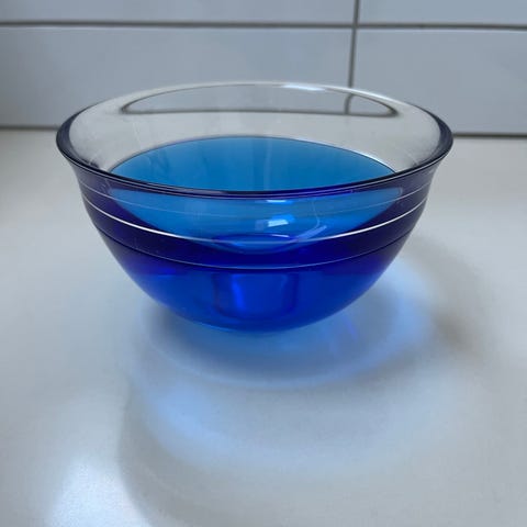 Fad og lille skål med blå bund og med en klar kant. Begge i helt perfekt stand.